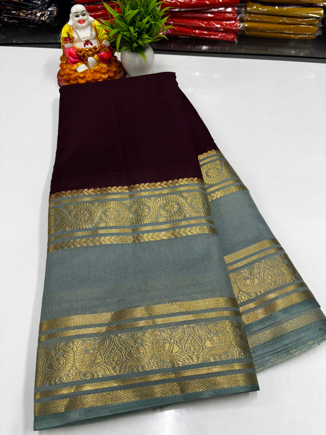 Mysore Crepe Silk Saree with Contrast Peacock Bentex Border ✨