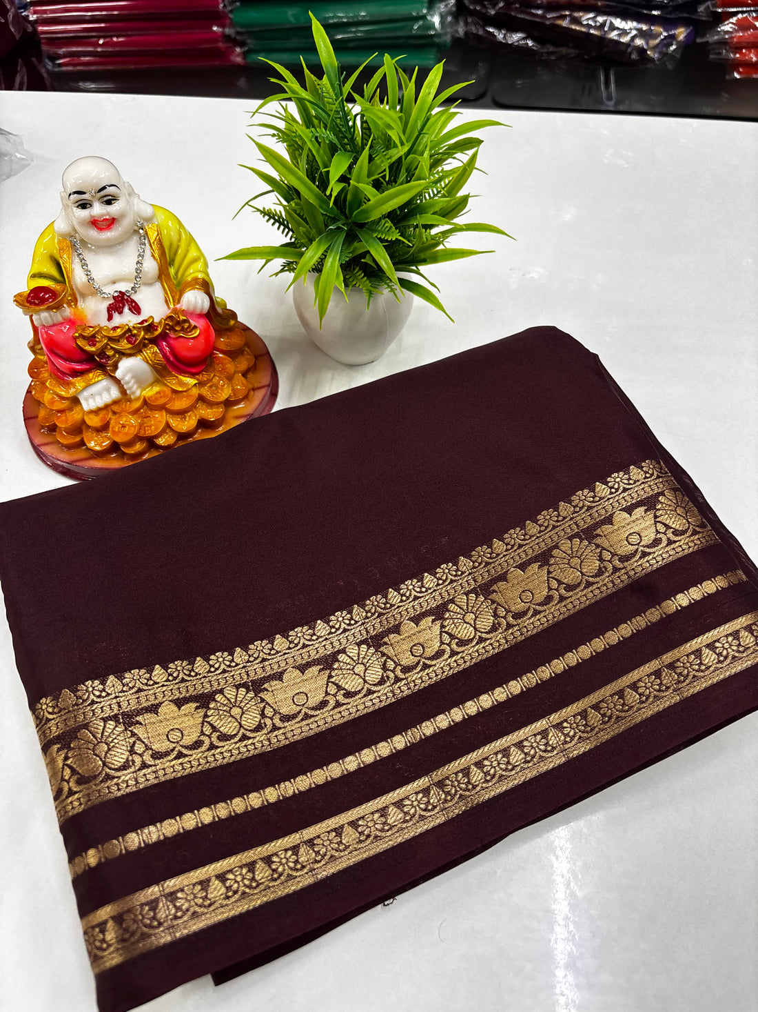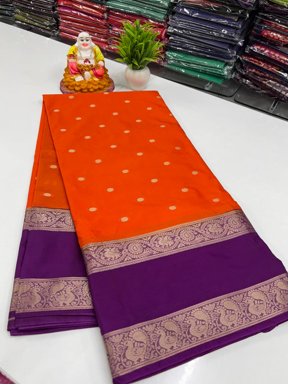Mysore Crepe Silk Saree with Buttas & Peacock Bentex Border Elevate your ethnic wardrobe with...