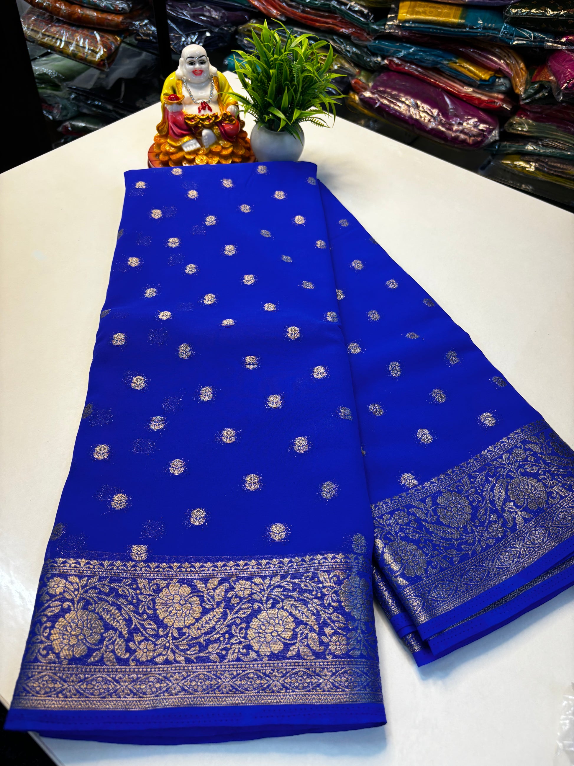 The delicate butta motifs spread across the saree add a classic traditional touch, while the richly designed pallu enhances its festive charm. Perfect for weddings, festive celebrations, parties, and special occasions, this saree beautifully blends tradition with modern elegance.