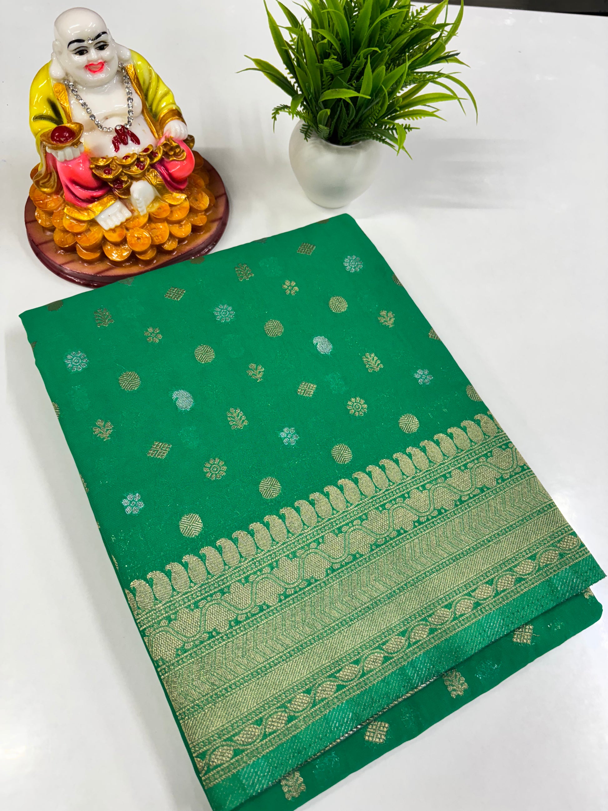 Experience timeless grace with our Georgette Butta Saree from Padmavathi Silks and Sarees. Crafted from premium georgette fabric, this saree features beautifully woven butta motifs that add a touch of subtle shimmer and traditional charm. Lightweight and flowy, it drapes effortlessly, making it perfect for festive occasions, parties, and celebrations.