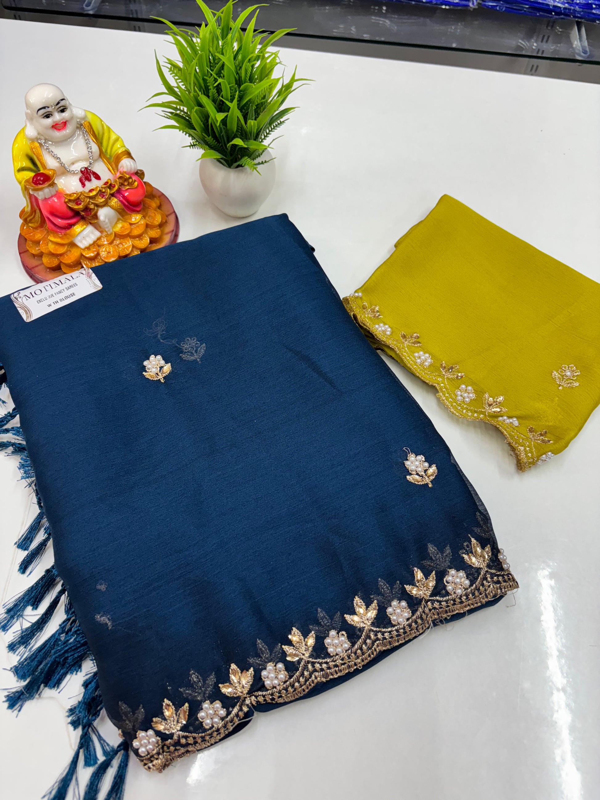Turn heads wherever you go with this fancy saree and contrast blouse combo — a true symbol of elegance and fine craftsmanship from Padmavathi Silks and Sarees.