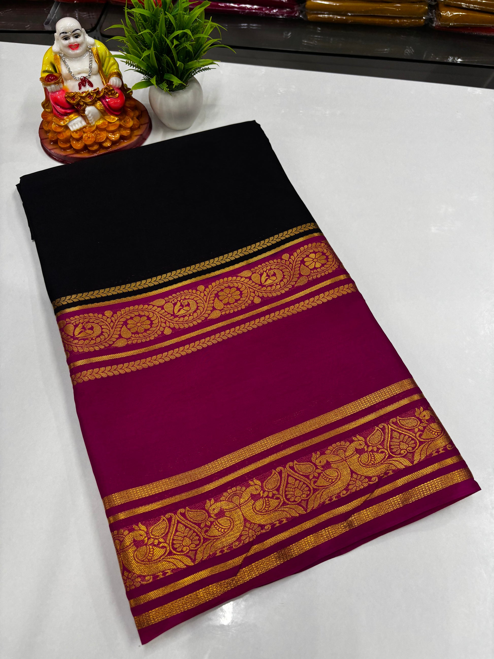Mysore Crepe Silk Saree – Peacock Bentex Border Elegance by Padmavathi Silks and Sarees ✨