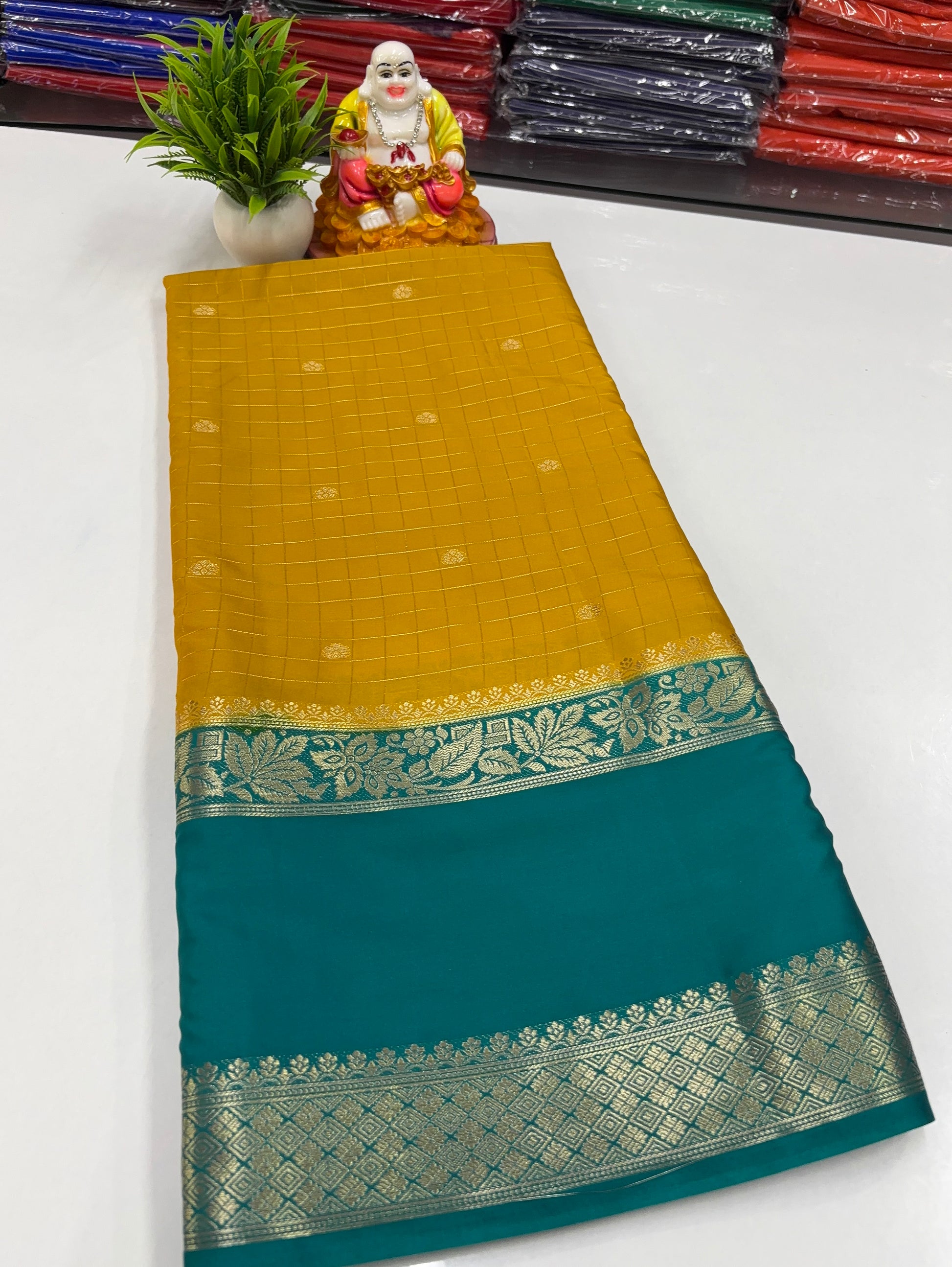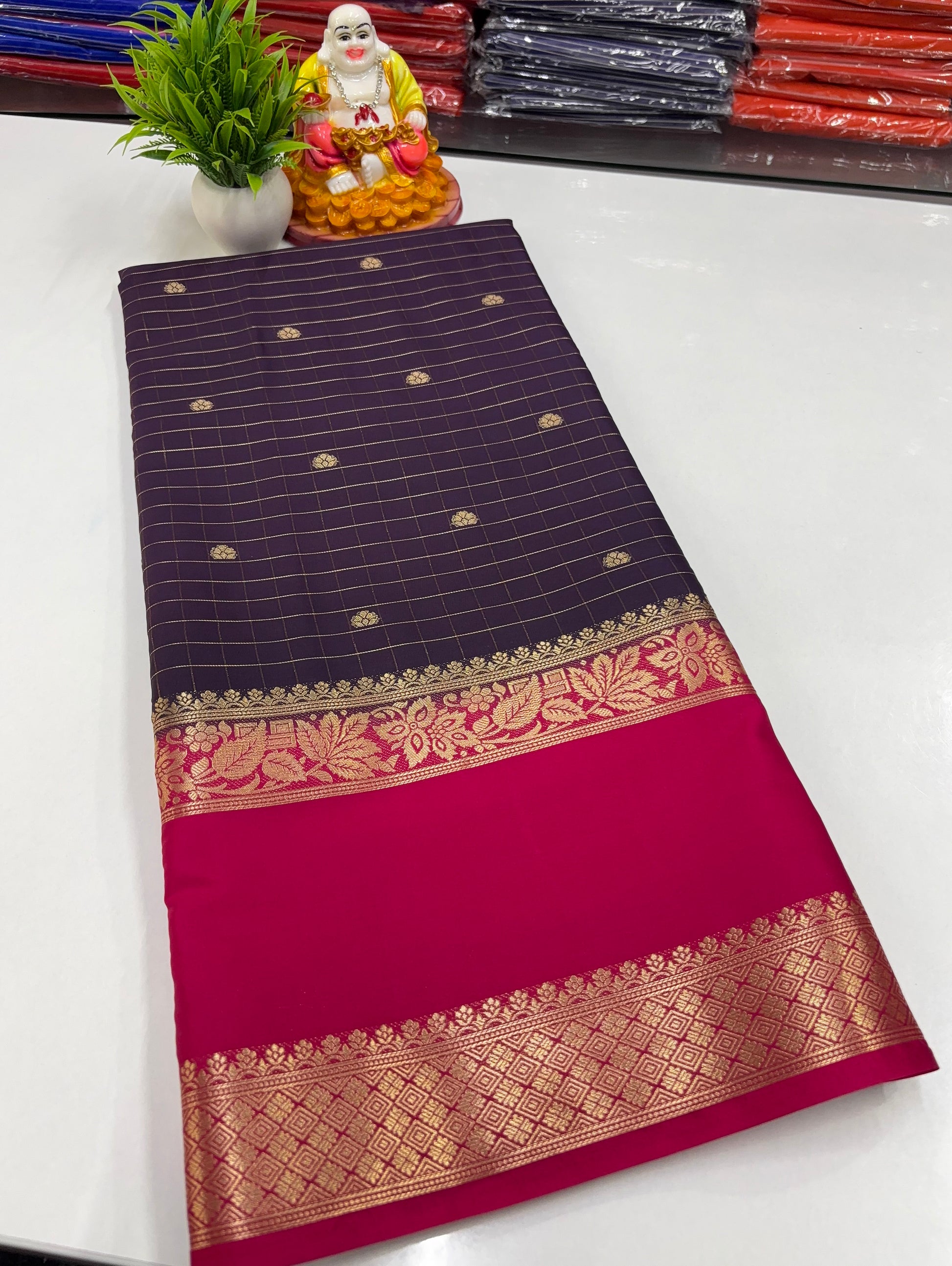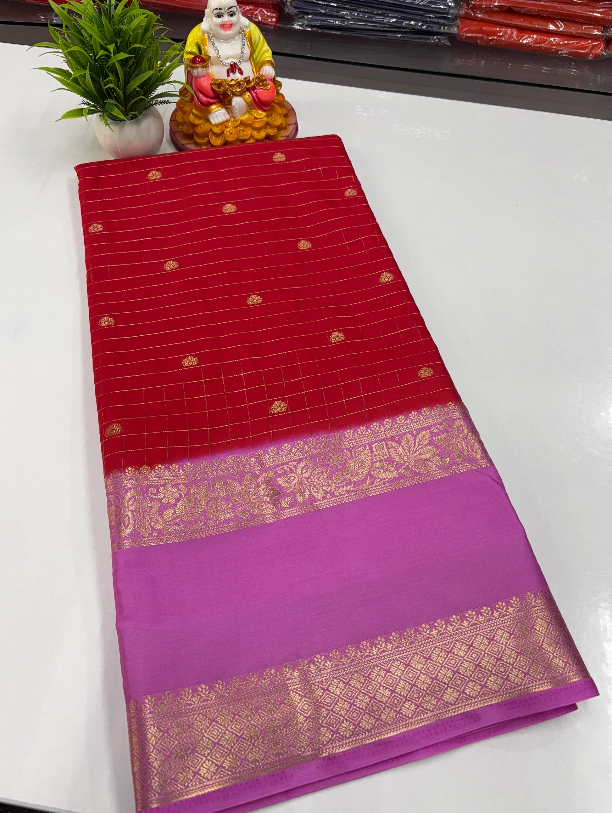 Grace your wardrobe with this elegant Mysore Crepe Silk Saree, beautifully crafted with a classic chex pattern highlighted by delicate buttas. The saree is enhanced with a richly designed pallu, adding a touch of traditional charm and festive elegance. Soft in texture and lightweight, this saree drapes effortlessly, making it perfect for weddings, festive occasions, and special celebrations.
