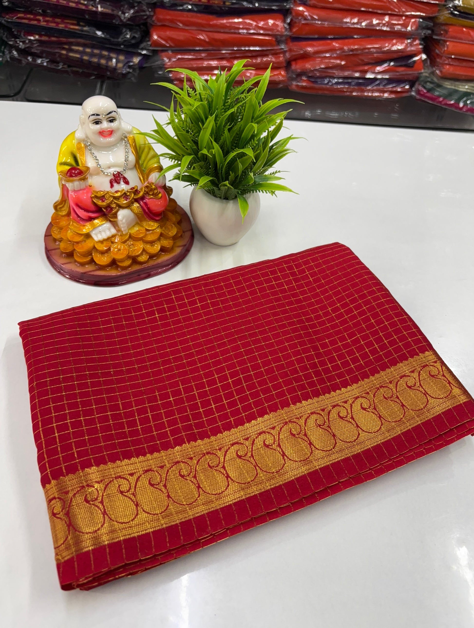 Mysore Crepe Silk Saree with Chex Pattern & Mango Border