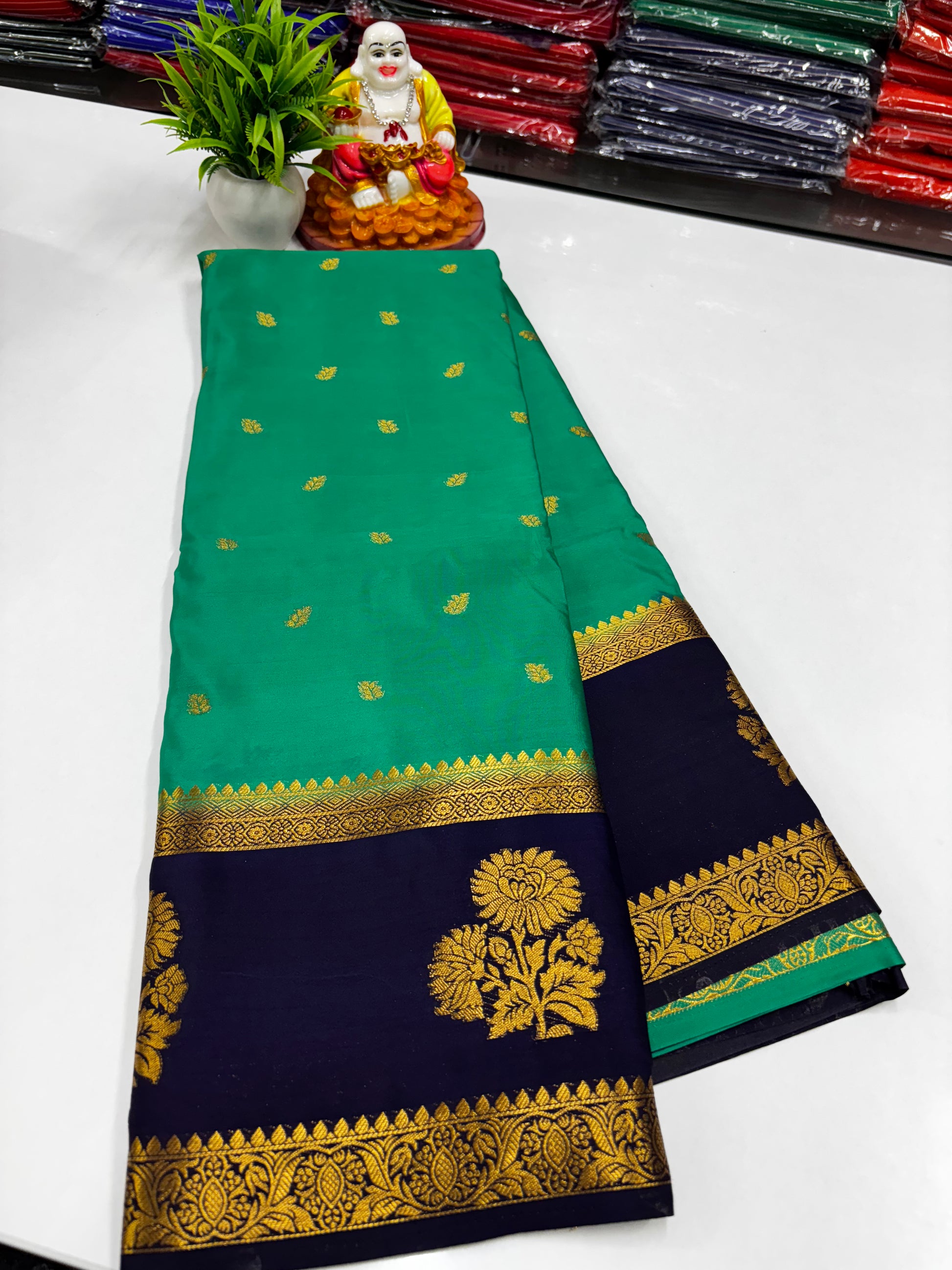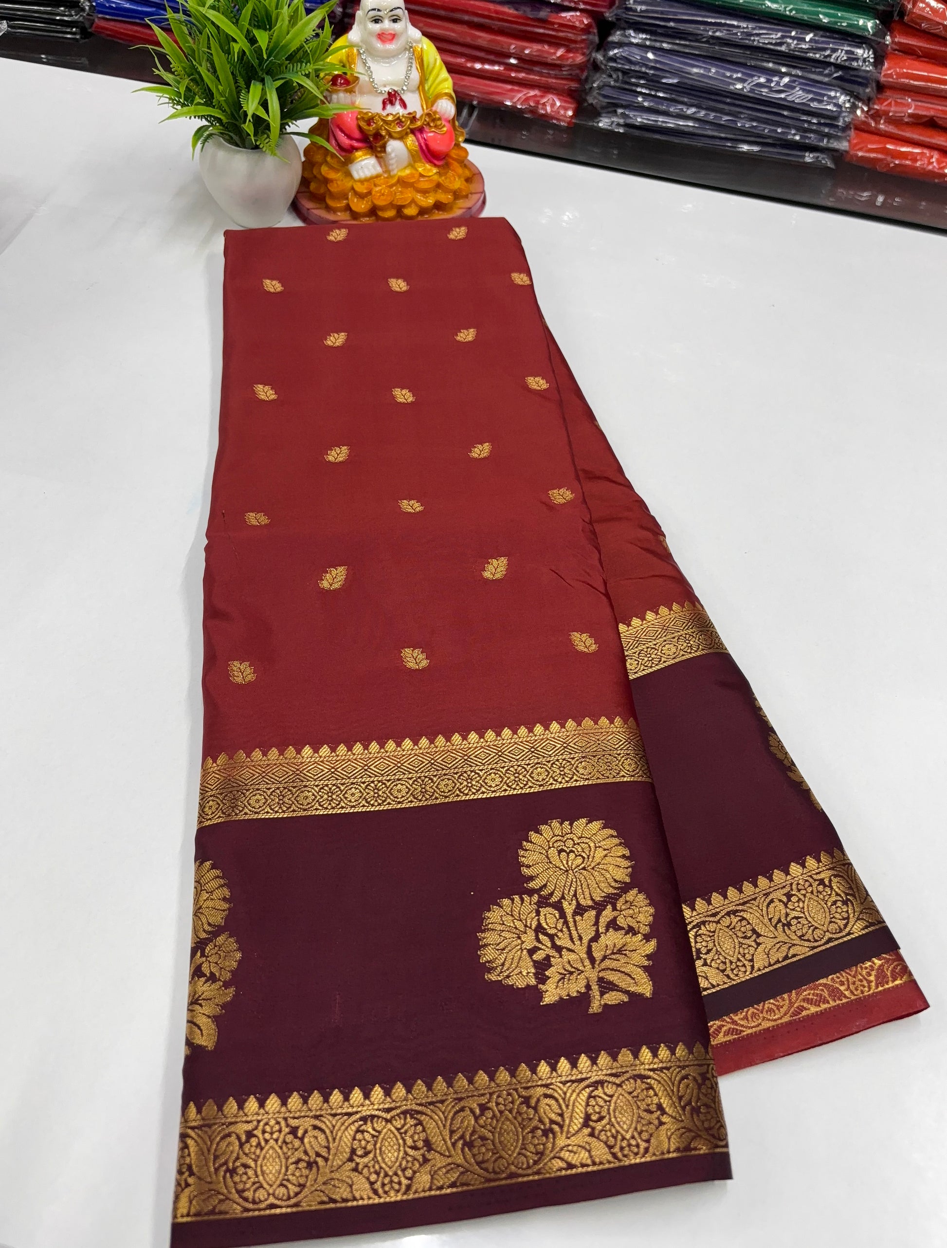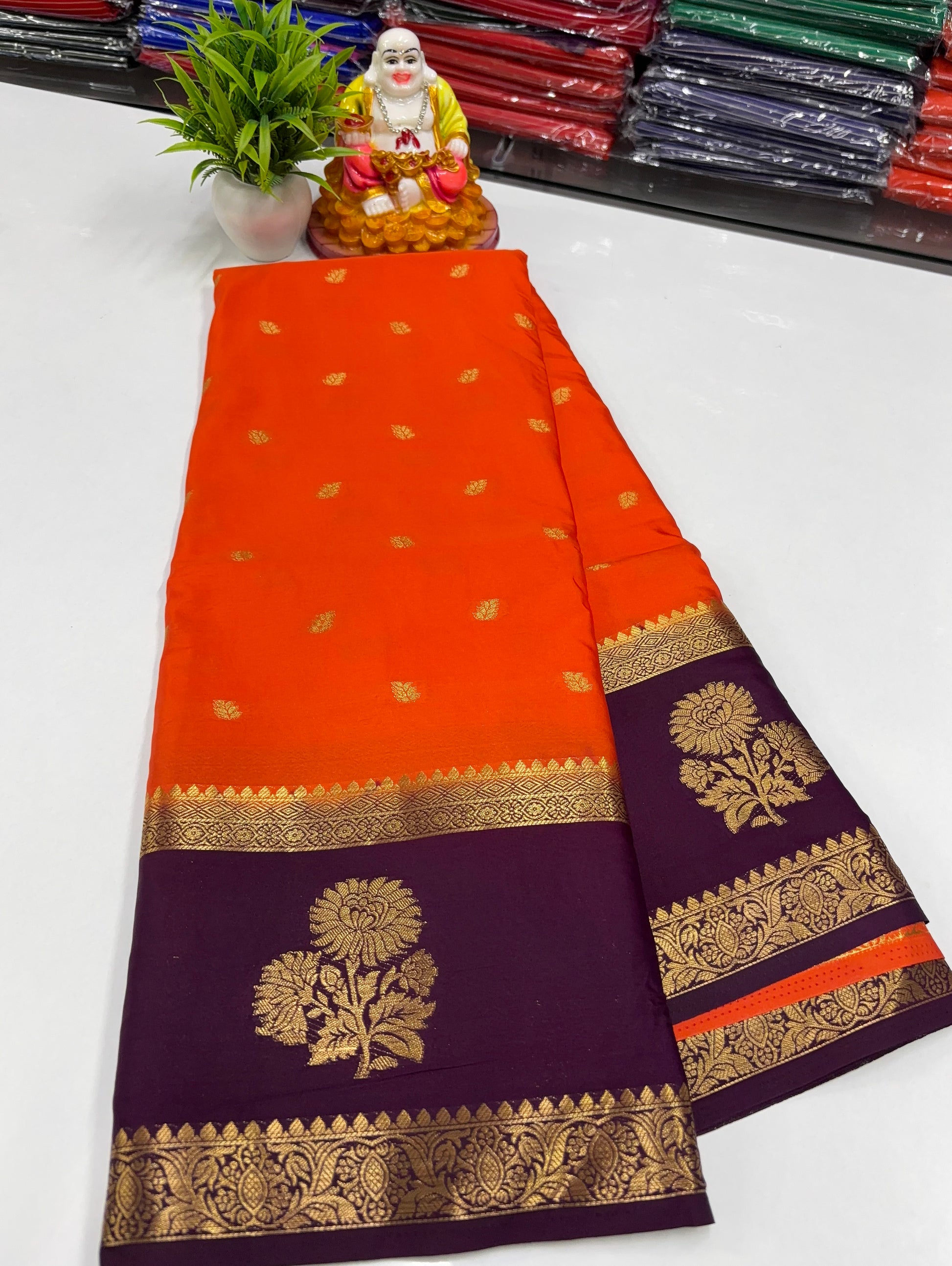 Experience timeless elegance with this premium Mysore Crepe Silk Saree, beautifully adorned with delicate leaf buttas that add a graceful and traditional charm. Crafted with a smooth, lightweight texture and a natural sheen, this saree drapes effortlessly, making it perfect for both festive occasions and elegant everyday wear.