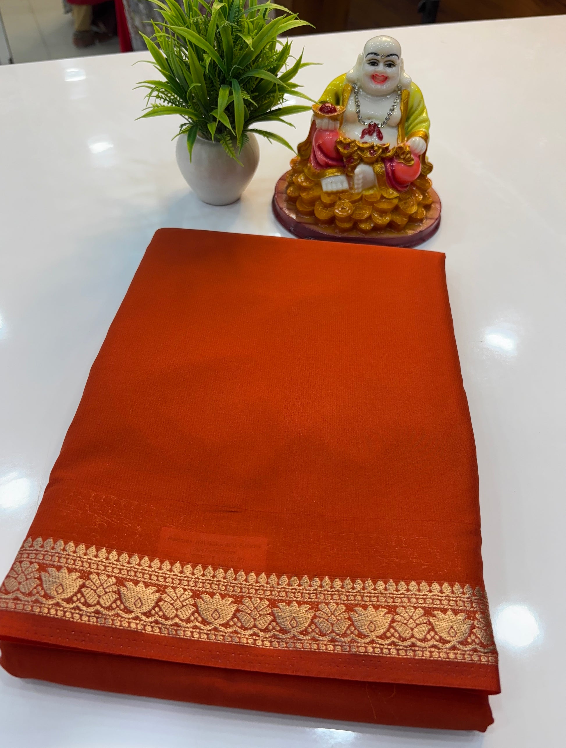 Grace meets tradition in this elegant Mysore crepe silk saree, beautifully crafted to enhance your timeless style. Designed with a delicate small lotus border, this saree reflects subtle charm and sophistication, making it perfect for both everyday elegance and special occasions.
