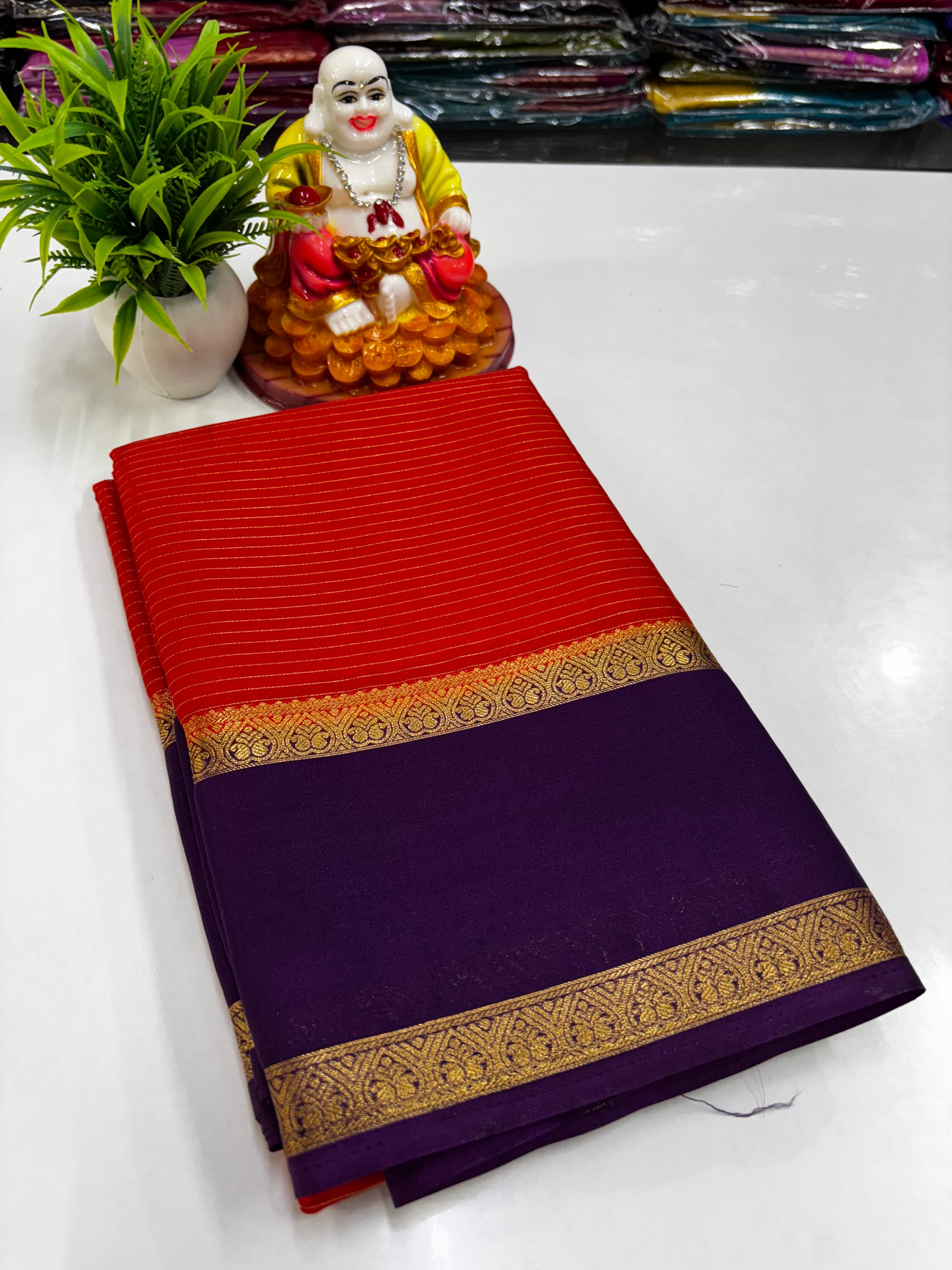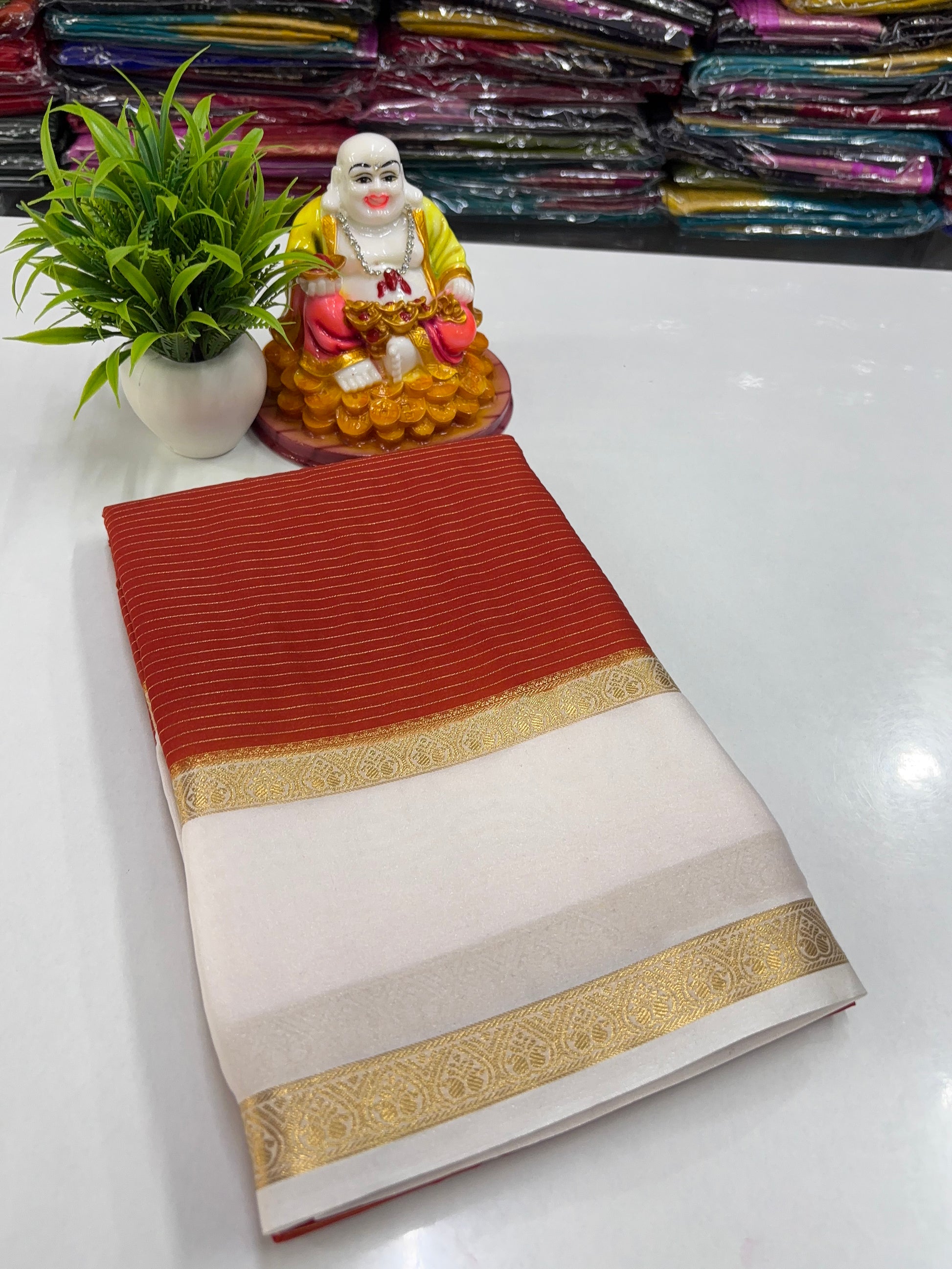 Elevate your ethnic wardrobe with this elegant Mysore crepe silk saree, featuring graceful stripe patterns across the body. The saree is beautifully enhanced with a classic Bentex border that adds a rich and traditional charm. Crafted from premium-quality crepe silk, it offers a soft texture, lightweight comfort, and a graceful drape—perfect for festive occasions, weddings, and special celebrations.