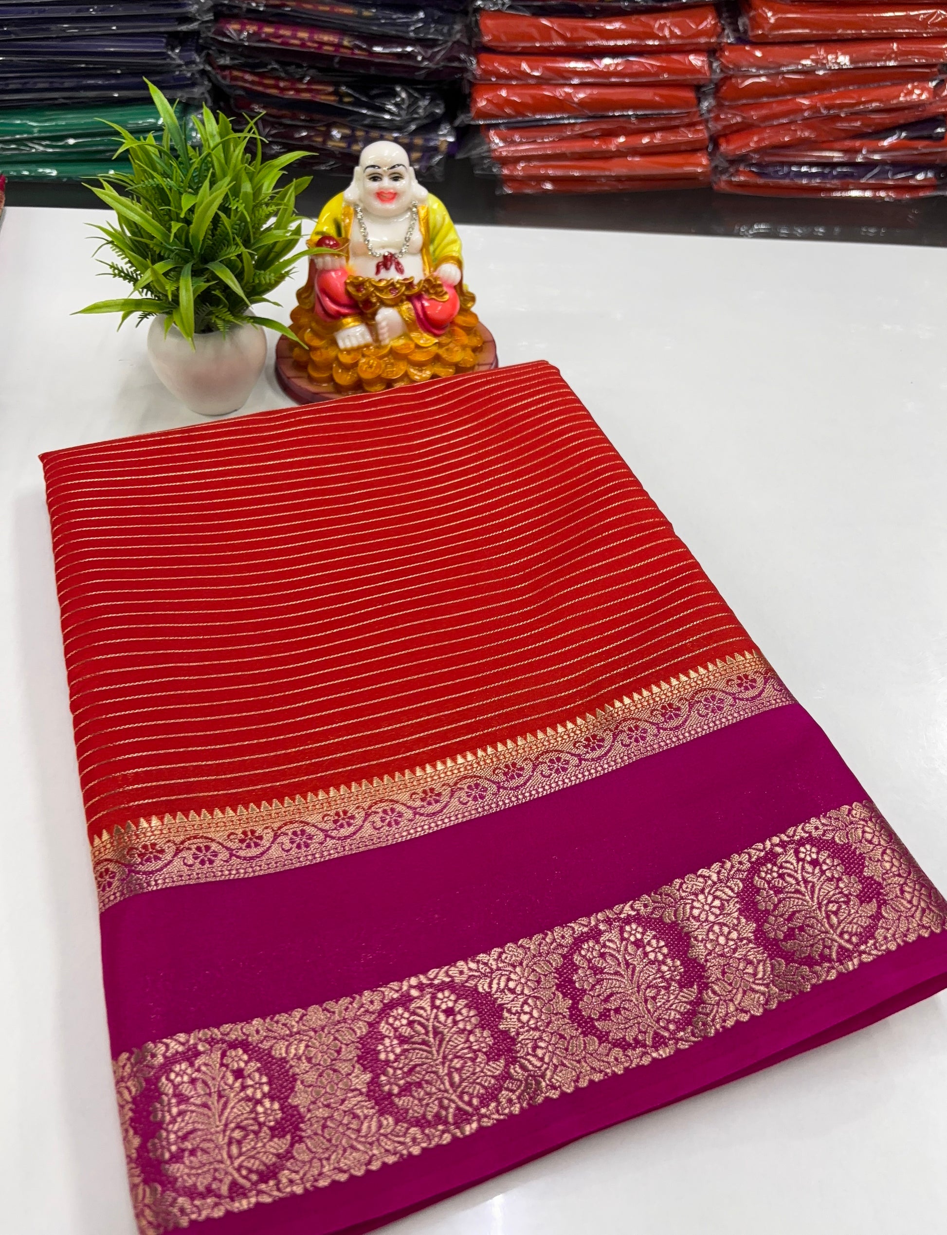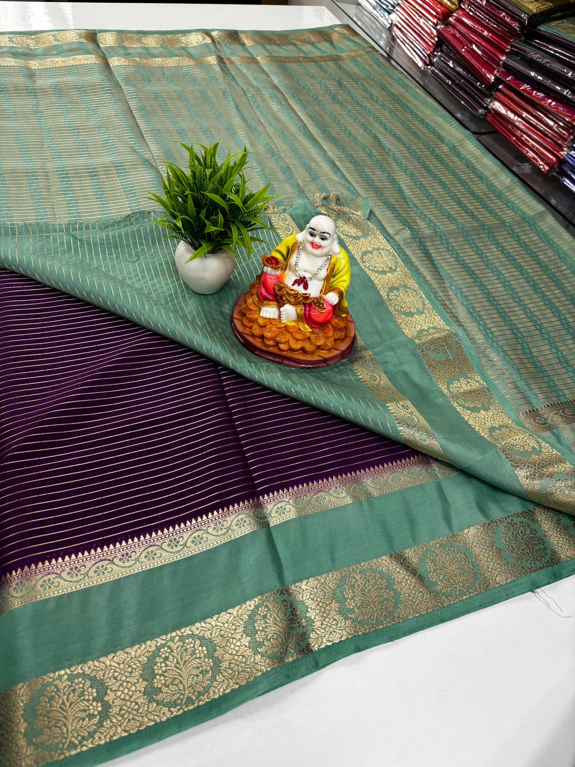 Experience timeless elegance with this premium Mysore crepe silk saree, beautifully adorned with graceful stripe patterns that add a modern yet traditional charm. Crafted in fine-quality crepe silk, the saree features a richly woven pallu that enhances its luxurious appeal, making it perfect for festive occasions and special celebrations.