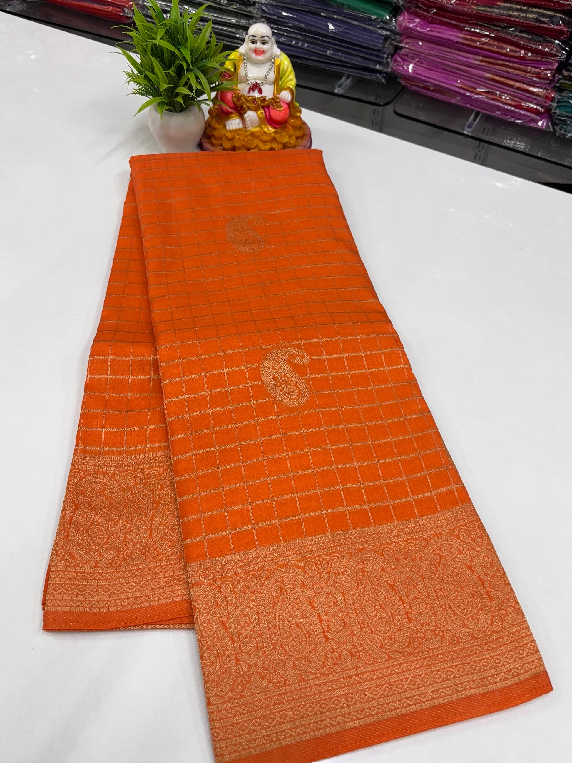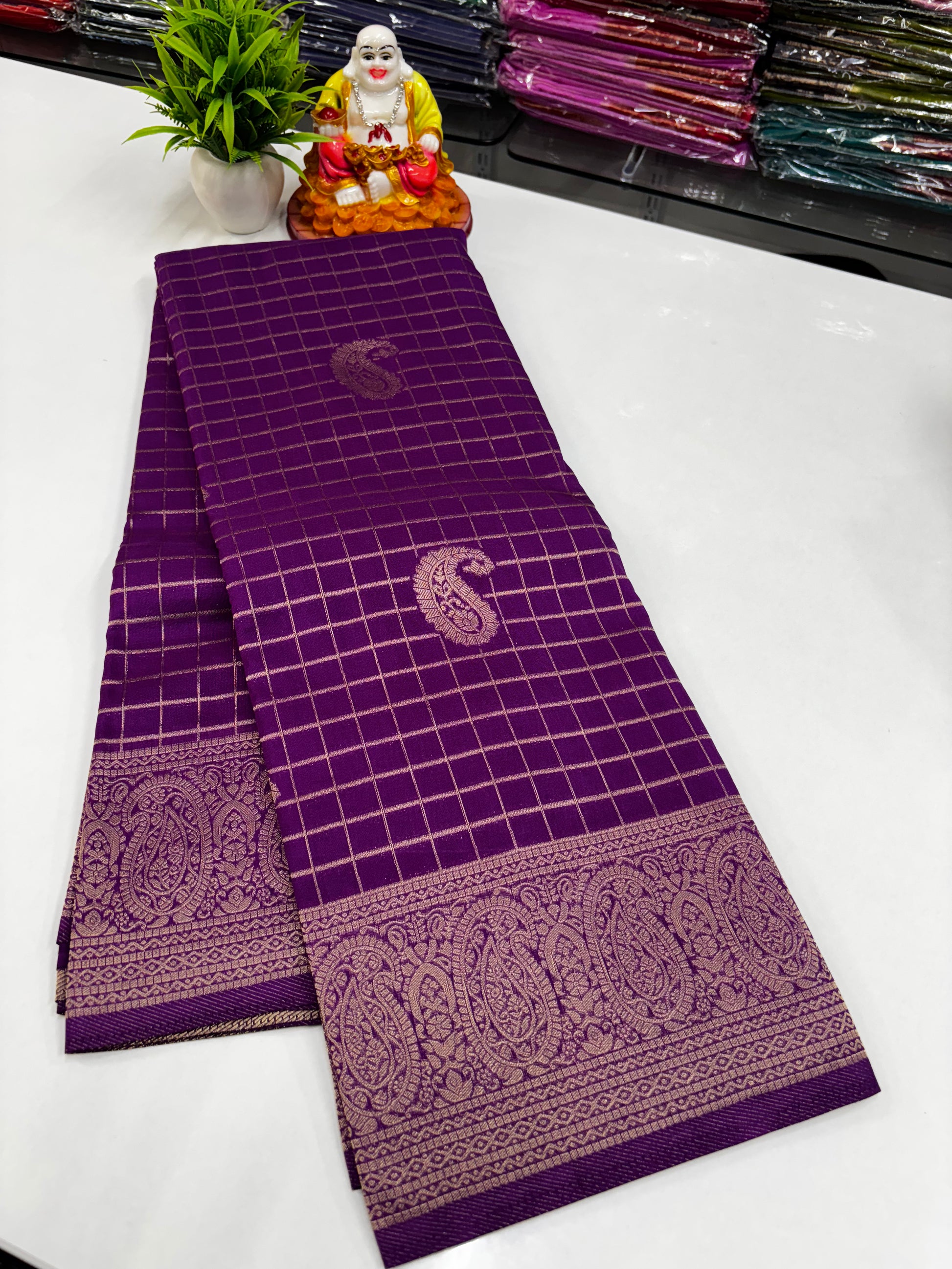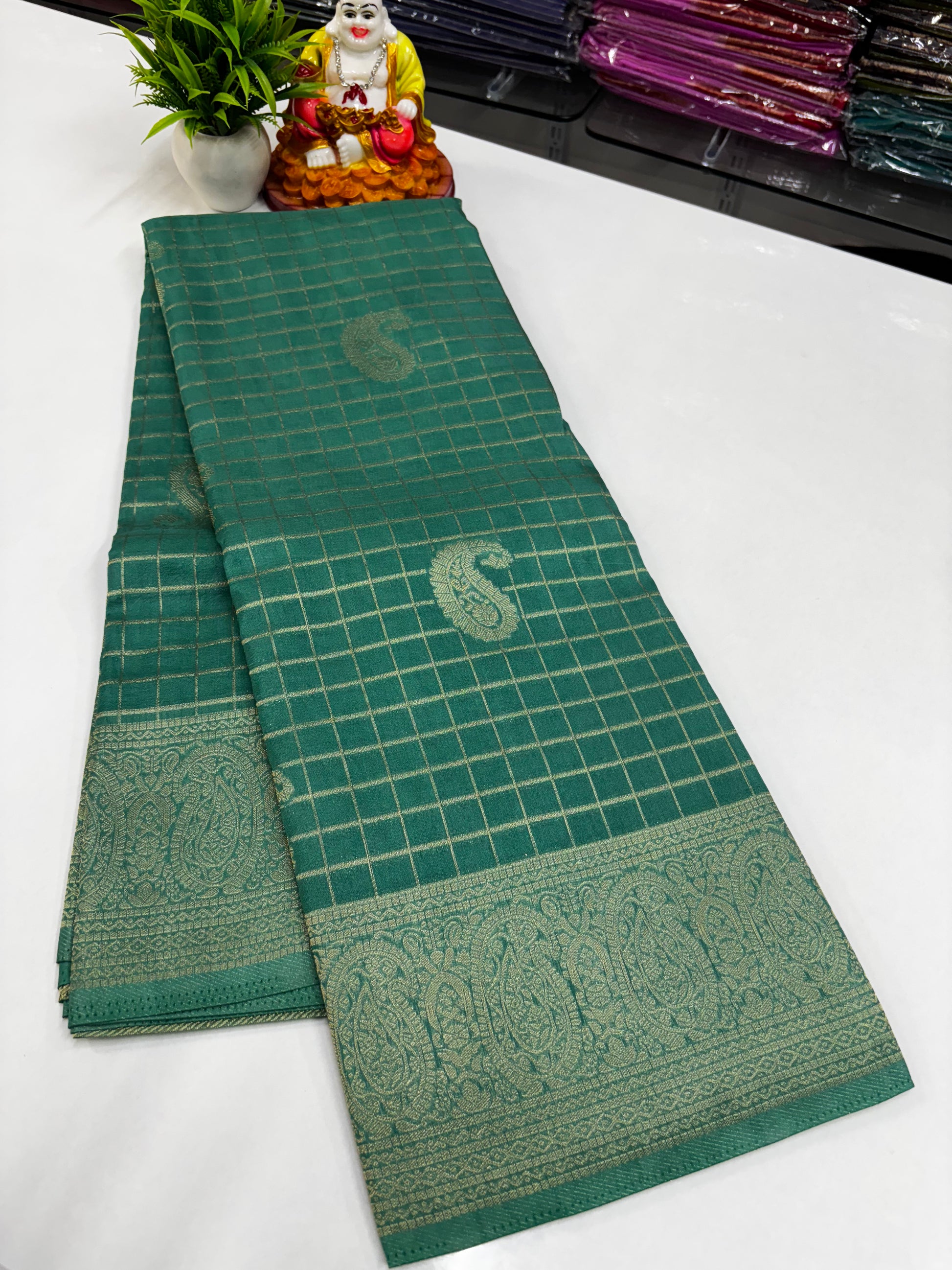 Elevate your ethnic wardrobe with this elegant premium georgette saree, beautifully crafted with a classic chex pattern across the body. The saree is enhanced with traditional mango (paisley) motifs, adding a timeless charm to the overall look.
