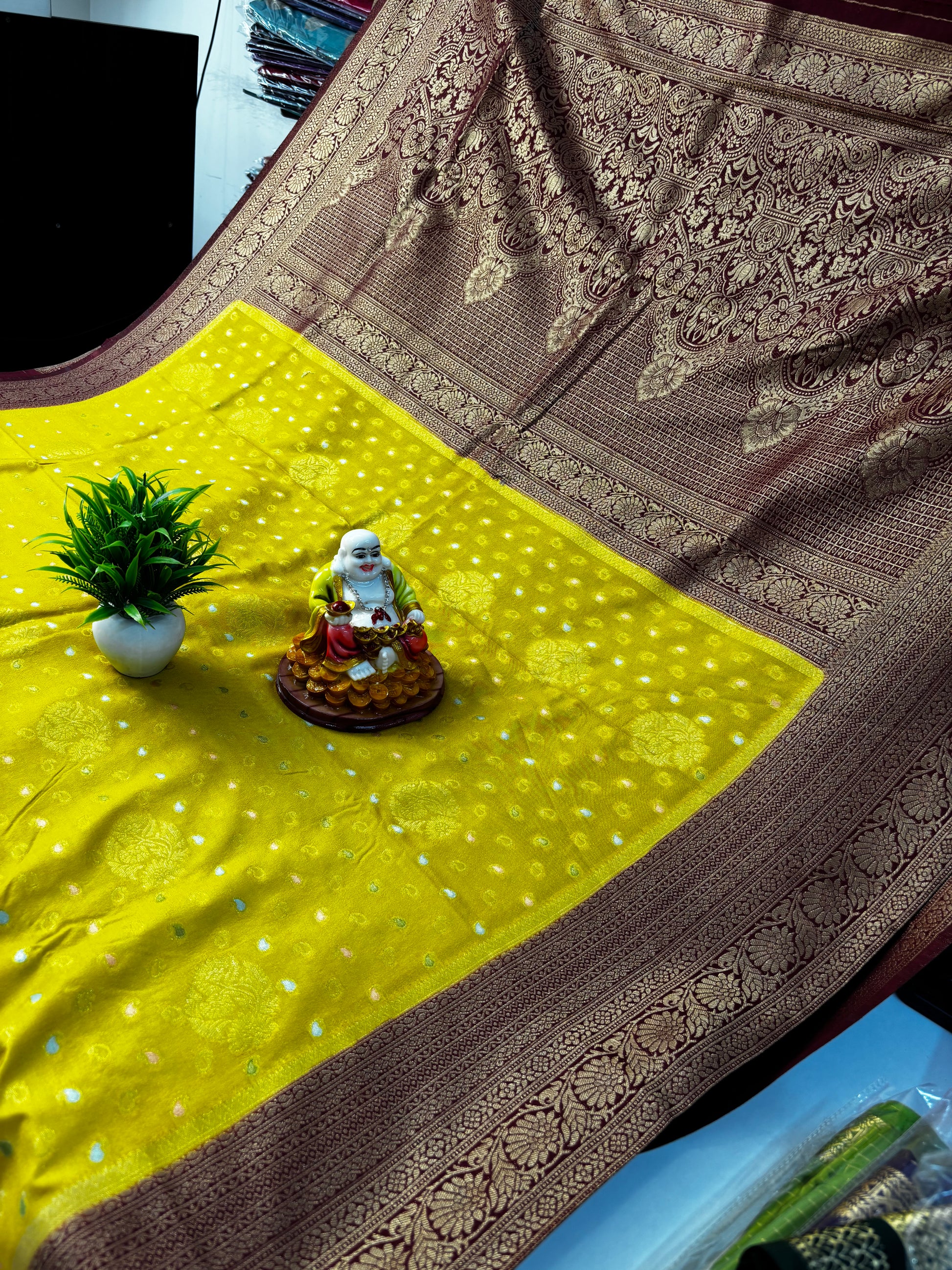 The saree features delicate butta motifs across the body, adding a touch of traditional beauty while maintaining a refined and classy appearance. The richly designed pallu enhances the grandeur of the saree, giving it a festive and luxurious finish that stands out at weddings, parties, and special celebrations.