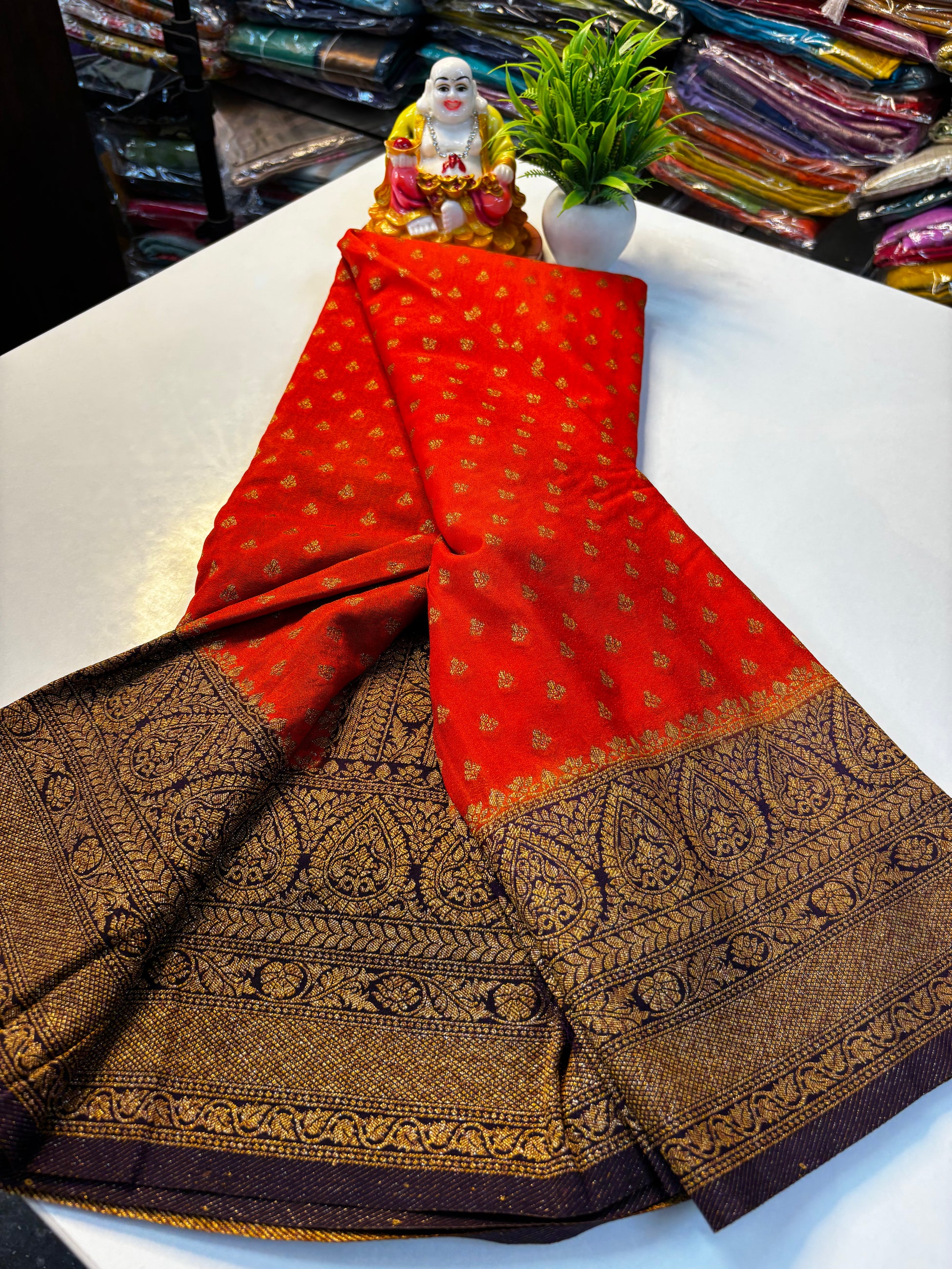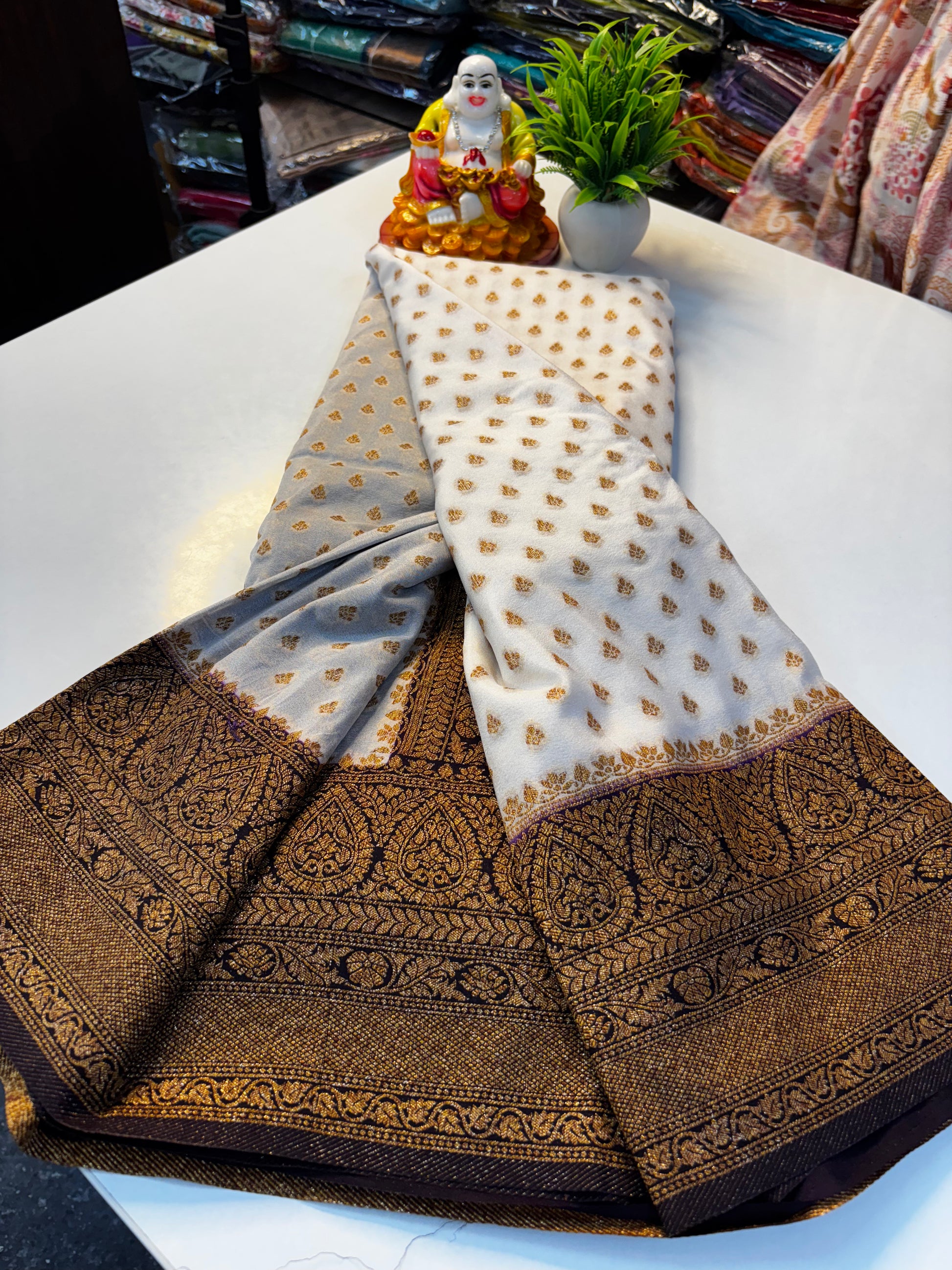 Experience elegance and timeless beauty with this premium Khaddi Georgette saree, thoughtfully crafted for women who love classic style with a graceful touch. The saree features delicate butta motifs spread across the body, adding a refined and sophisticated look. Its richly designed pallu enhances the overall charm, making it perfect for festive occasions, celebrations, and special gatherings.