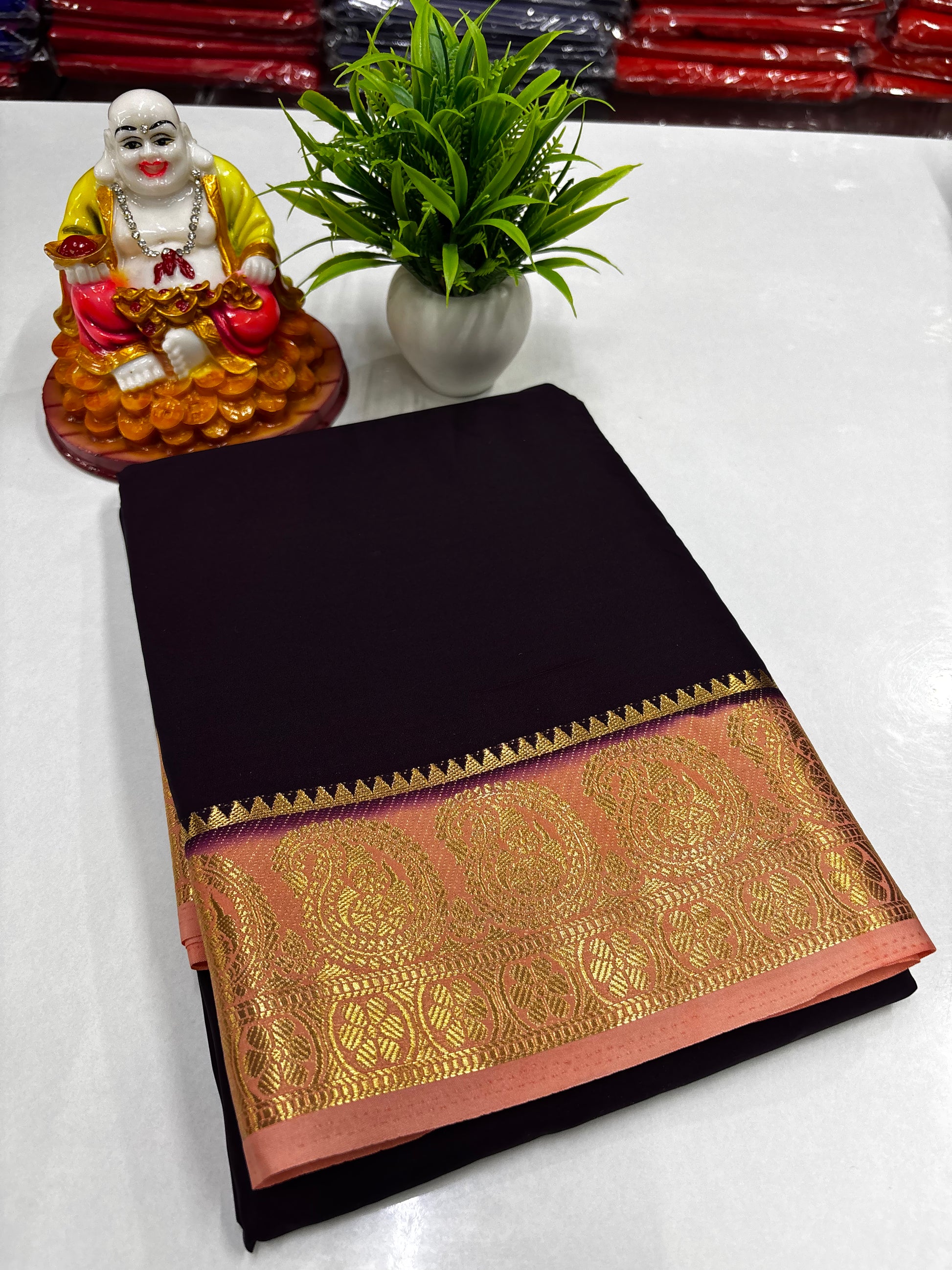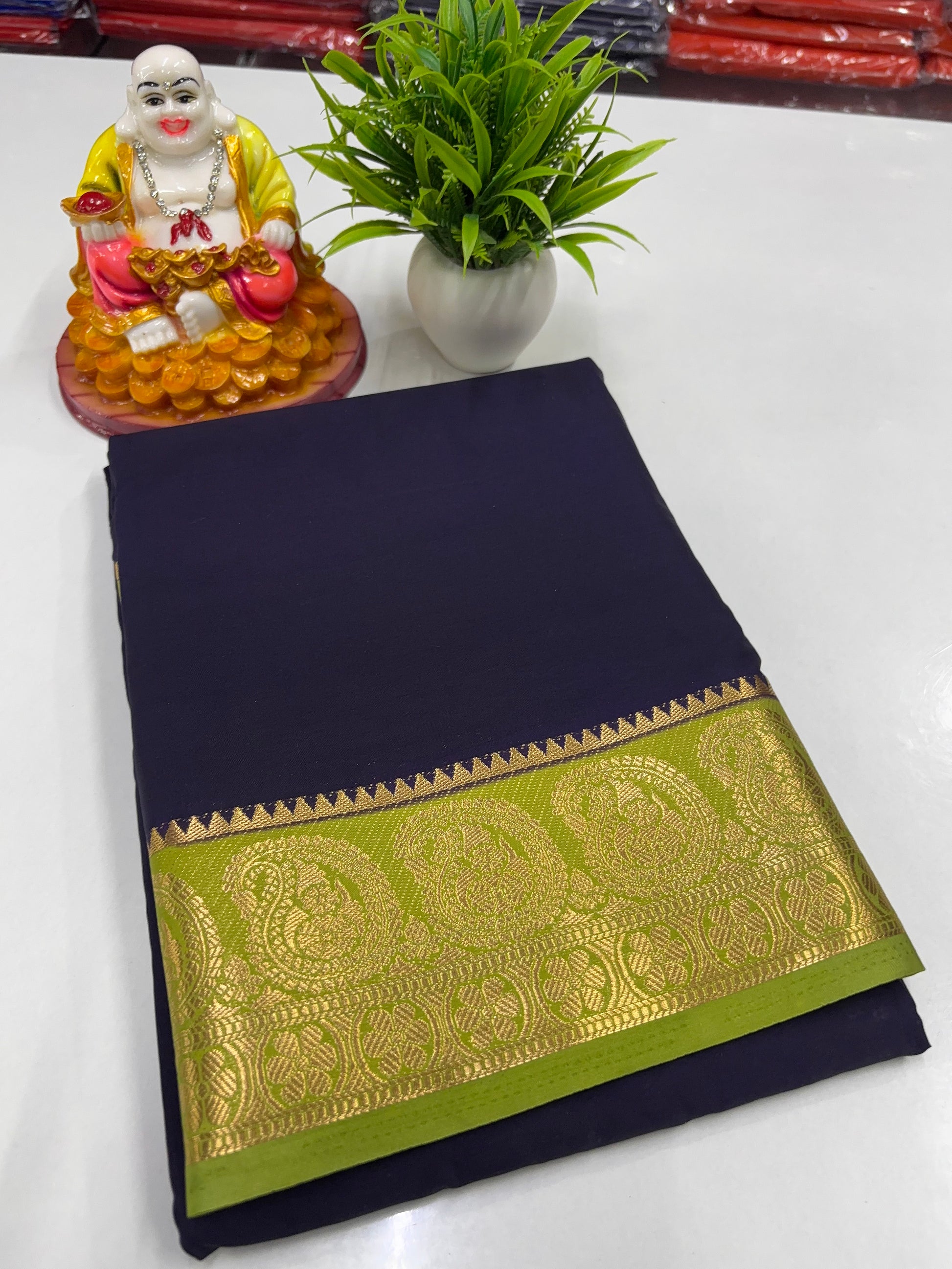 Experience timeless elegance with this Premium Mysore Crepe Silk Saree, crafted to perfection for women who appreciate classic tradition with a graceful touch. The saree features a beautiful mango motif border, adding a rich and auspicious charm to its luxurious drape.