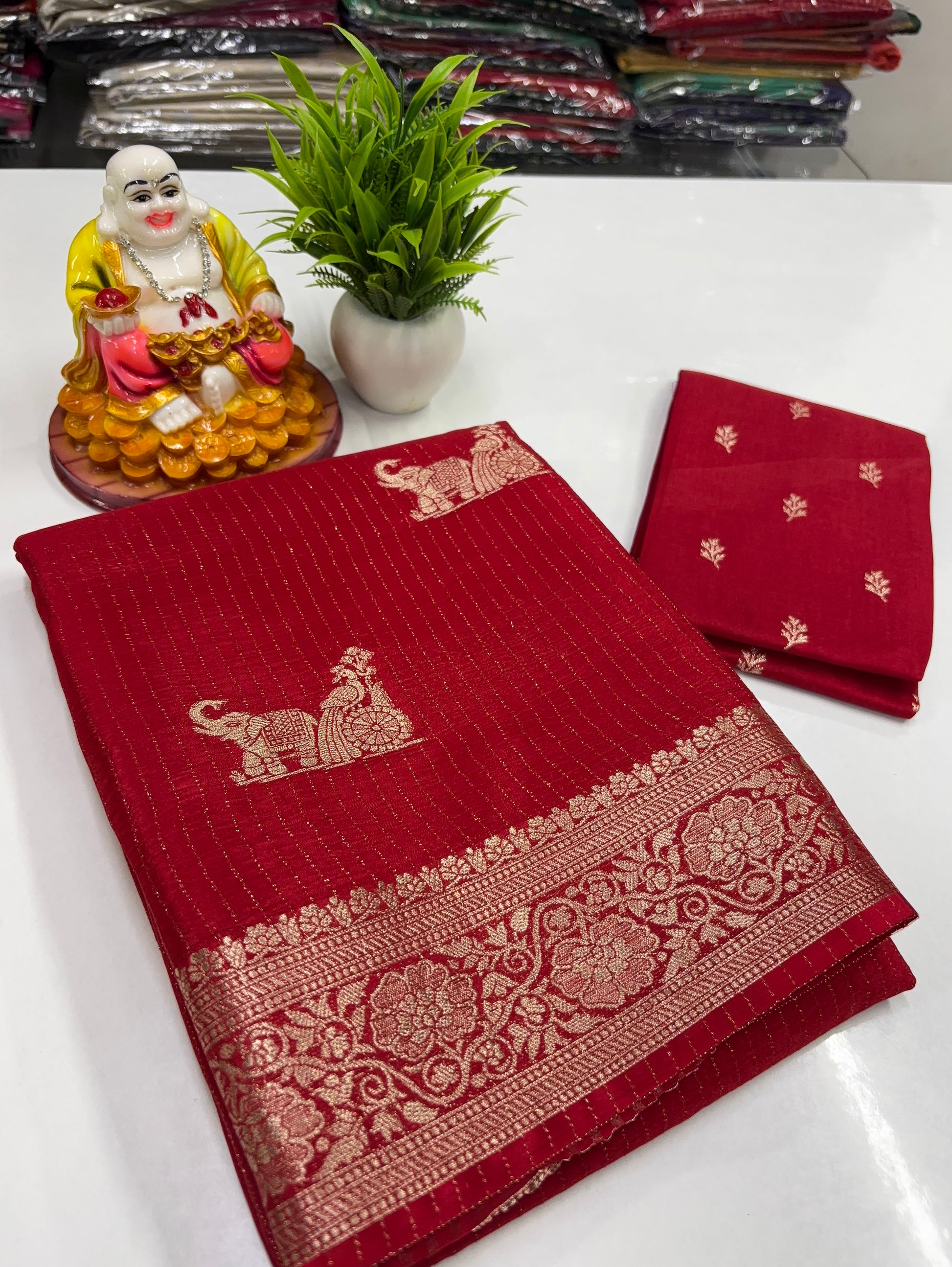 Drape yourself in grace with this premium viscose saree adorned with beautiful elephant and peacock buttas, symbolising heritage, prosperity, and timeless charm. The soft, flowy viscose fabric offers a luxurious feel and elegant fall, making it perfect for festive occasions, celebrations, and special events.