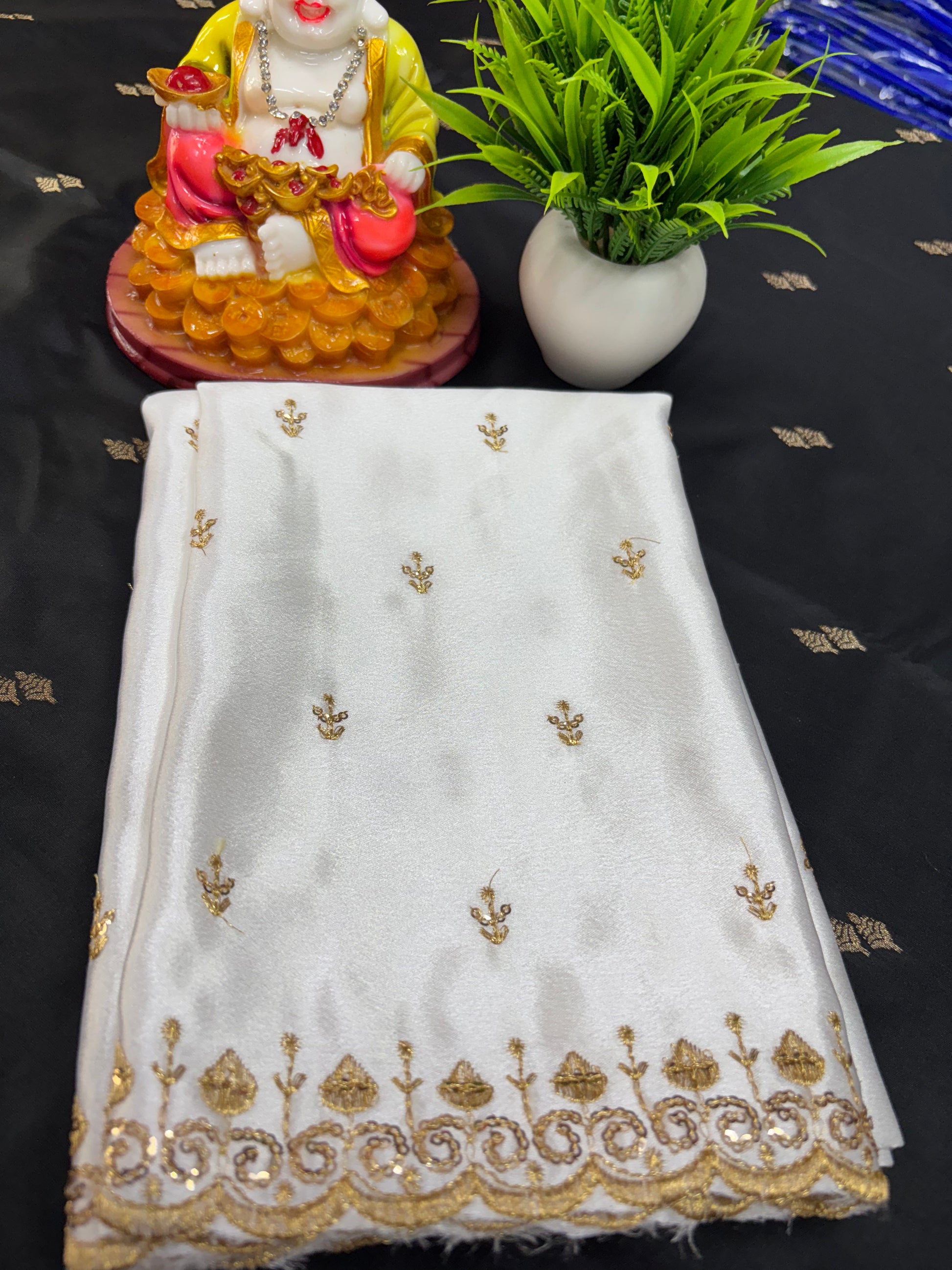 Elevate your saree look with this satin white blouse — a perfect blend of sophistication, comfort, and timeless beauty from Padmavathi Silks and Sarees.