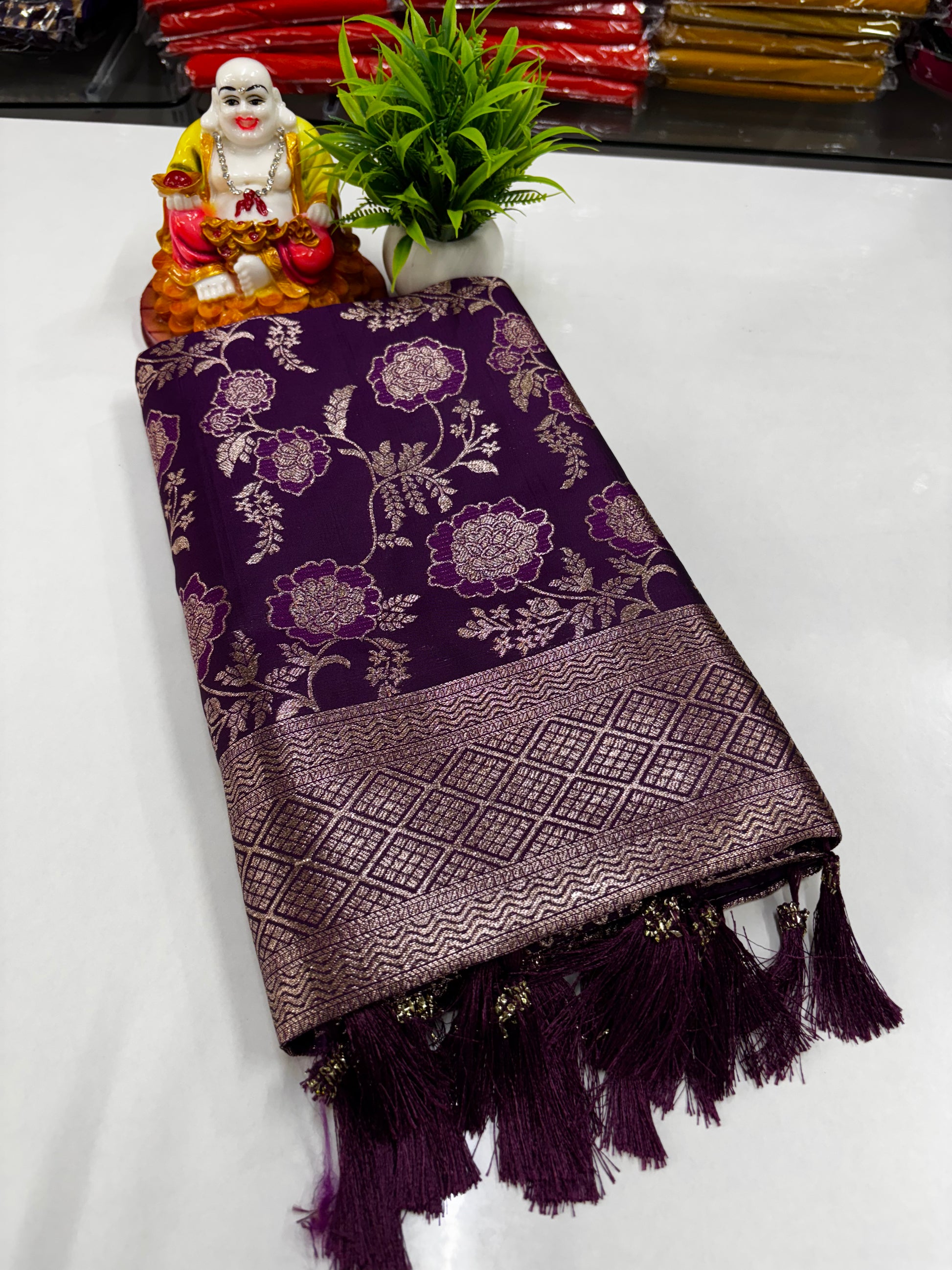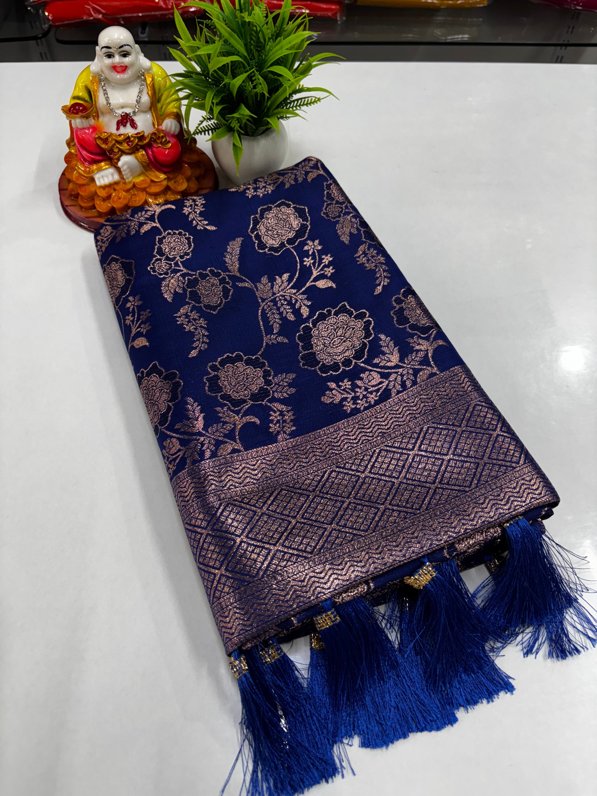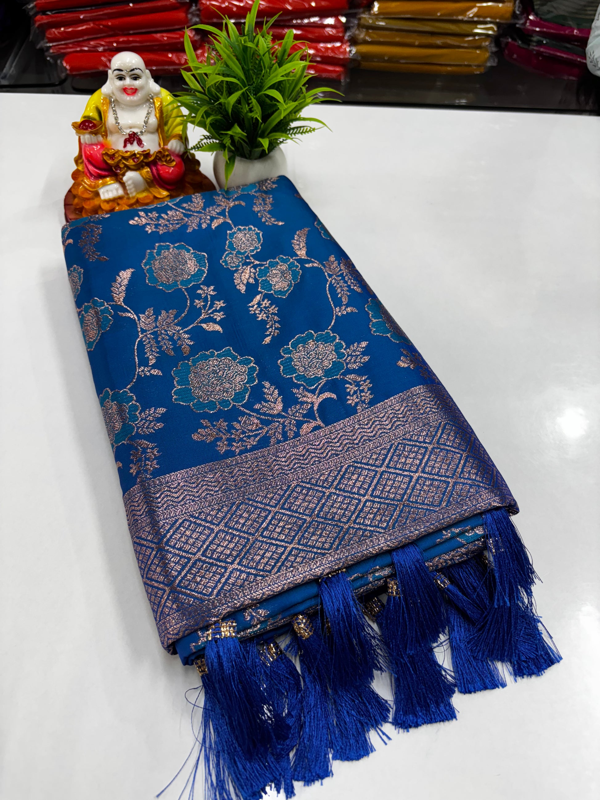Add a touch of timeless grace to your wardrobe with this beautiful semi silk saree featuring an exquisite meenakari-inspired design adorned with delicate floral motifs. The smooth semi-silk fabric offers a perfect blend of shine, comfort, and elegance—ideal for festive wear, traditional functions, and celebrations.